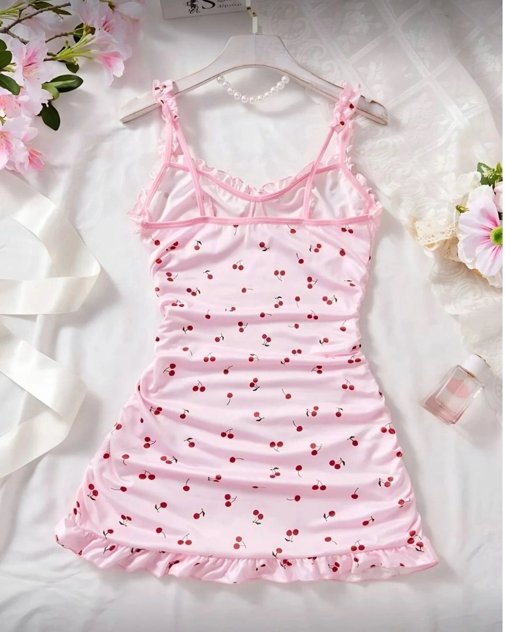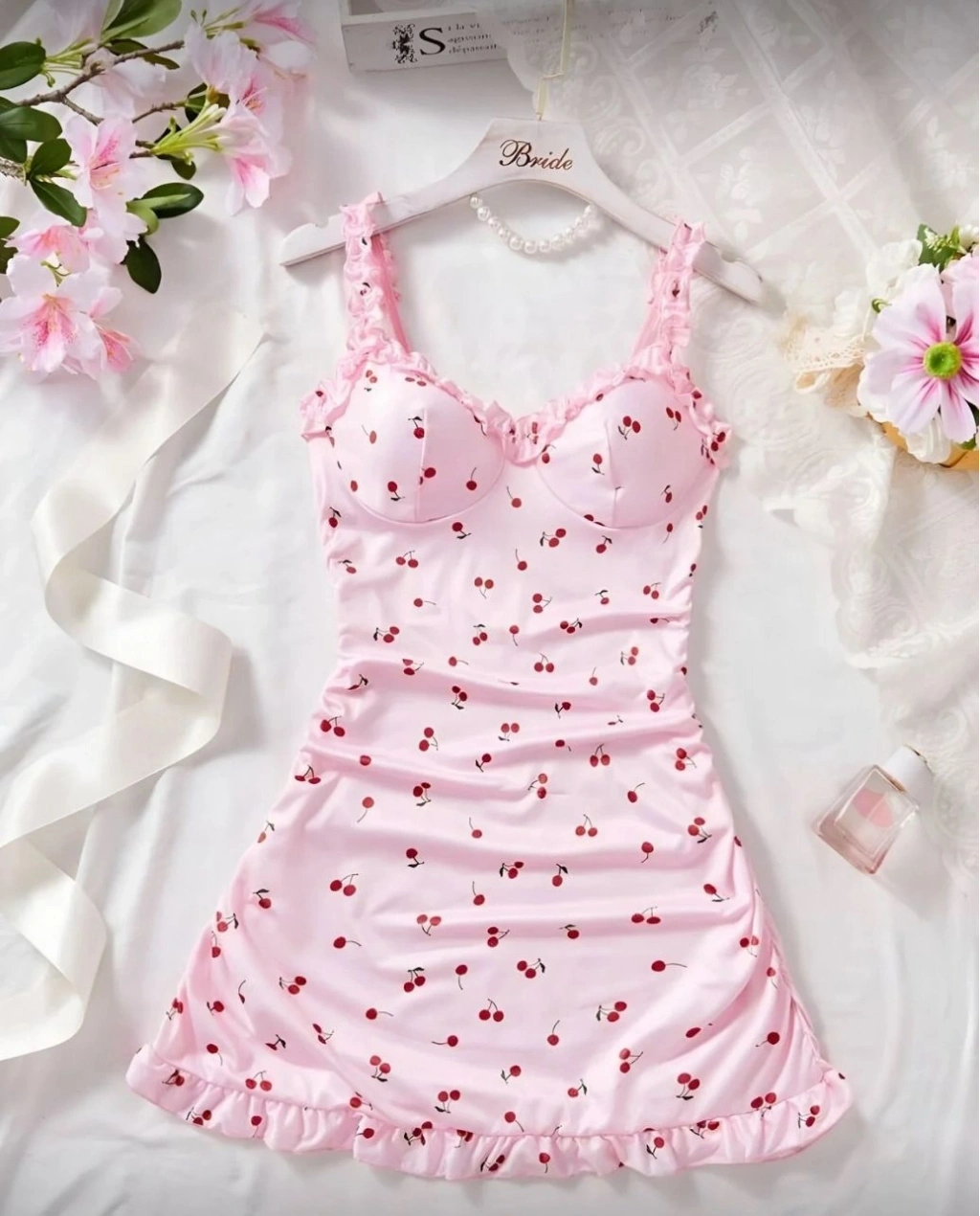 Görseldeki pembe kiraz desenli elbise için hazırladığım ürün özellikleri aşağıdadır: