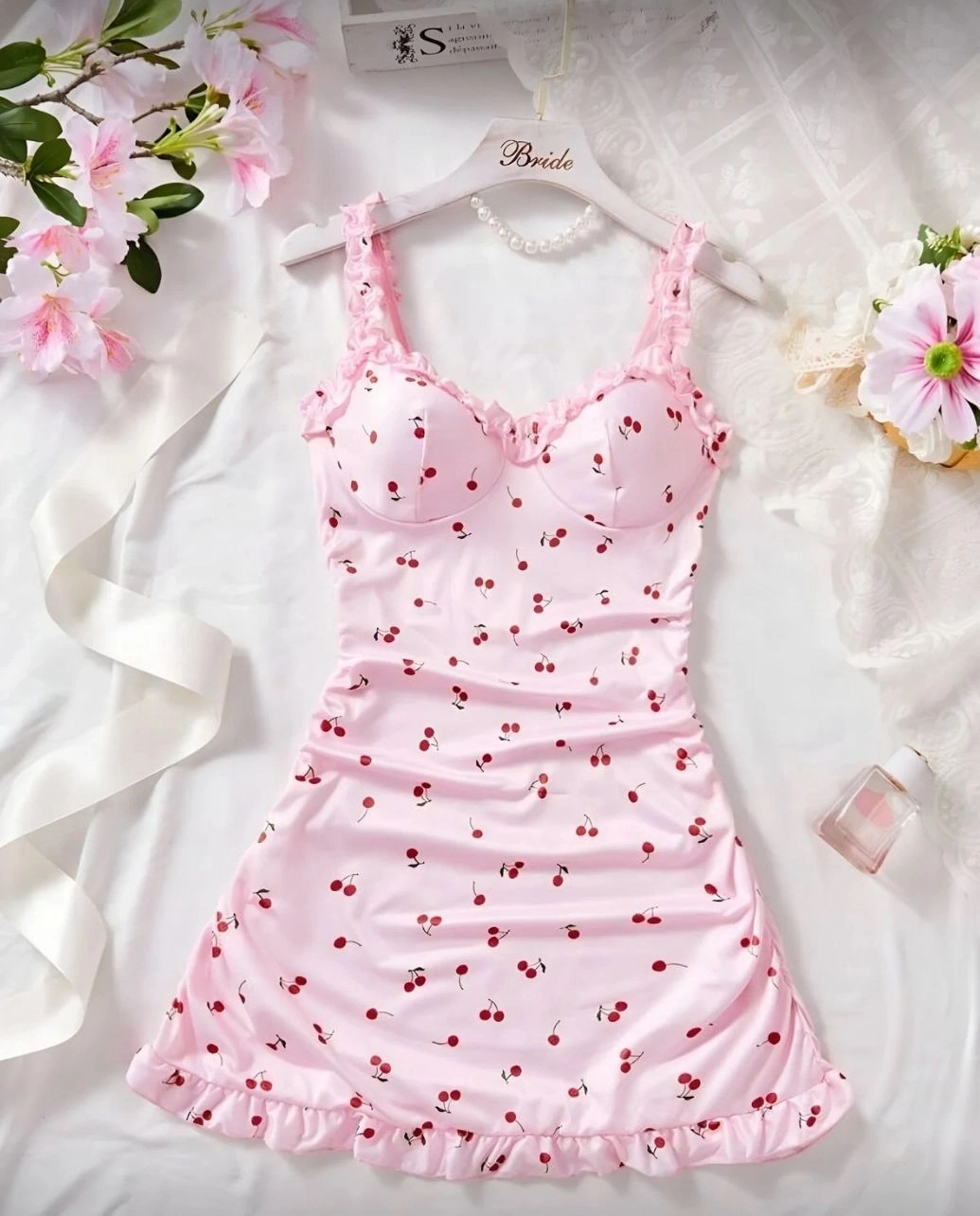 Detaylar: Yaka ve etek kısımlarında fırfır detayları mevcuttur; göğüs kısmı formlu ve destekli bir tasarıma sahiptir.
