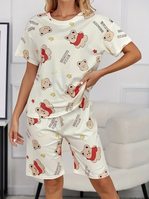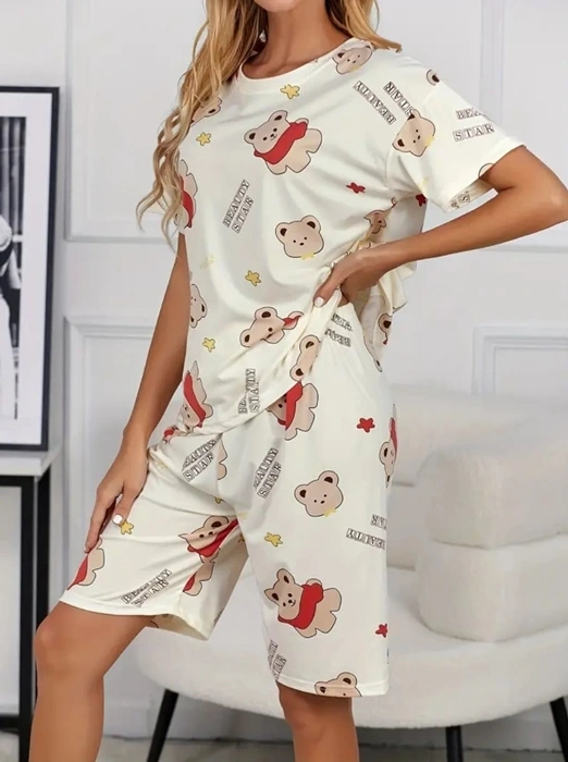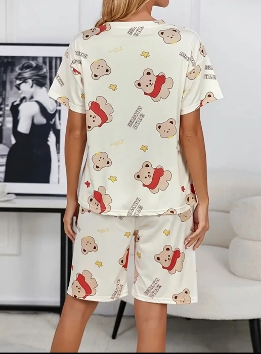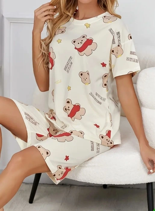 Mor Subvay markasının krem pamuklu ayıcık baskılı şortlu pijama takımı, rahatlığı ve şirinliği bir arada sunar.