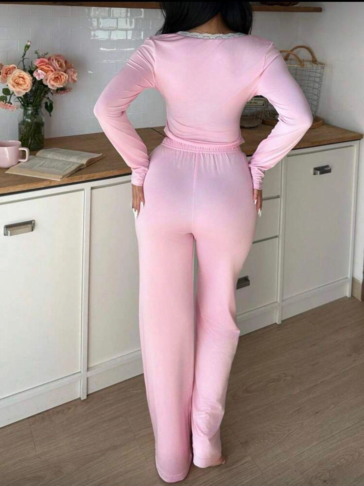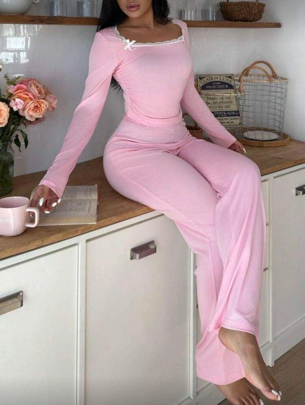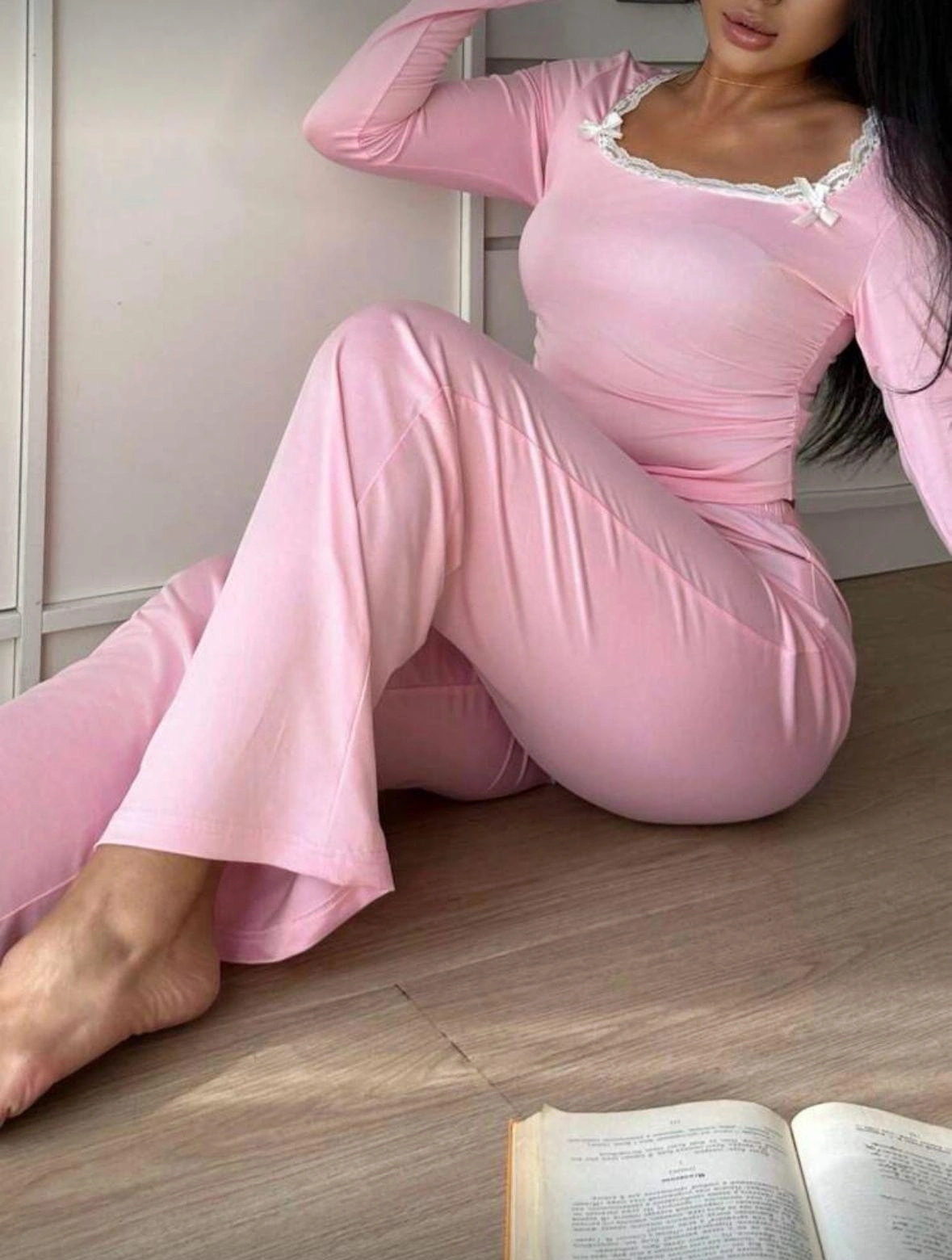 Soft pembe tonunun huzur veren enerjisini zarif detaylarla birleştiren bu ikili takım, şıklığından ödün vermeden rahat etmek isteyenler için tasarlandı. Modern kesimi ve romantik dokunuşlarıyla ev giyimine yeni bir soluk getiriyor.