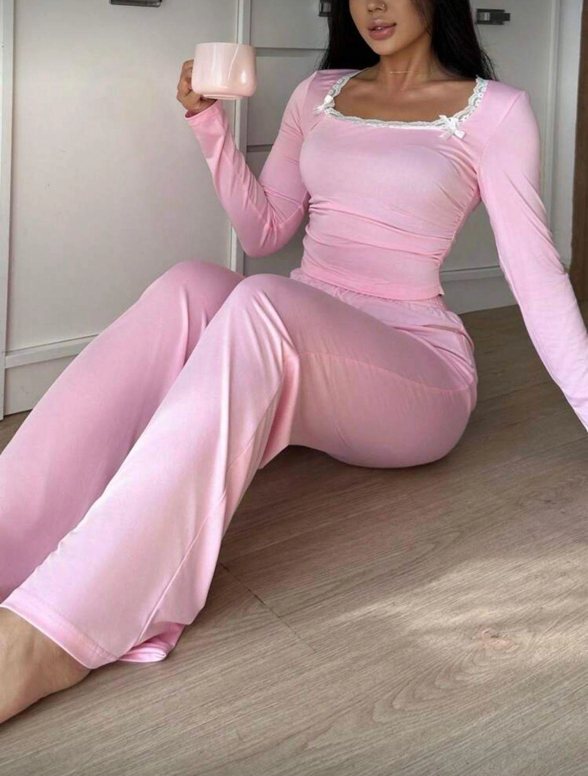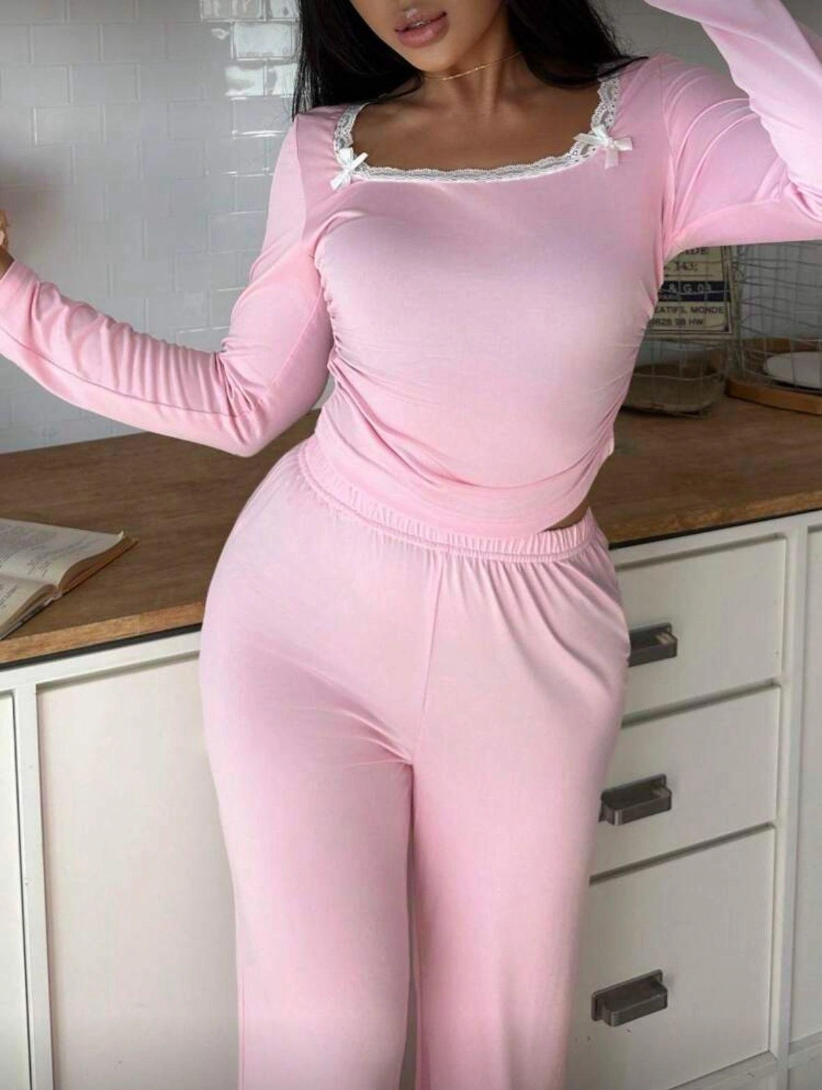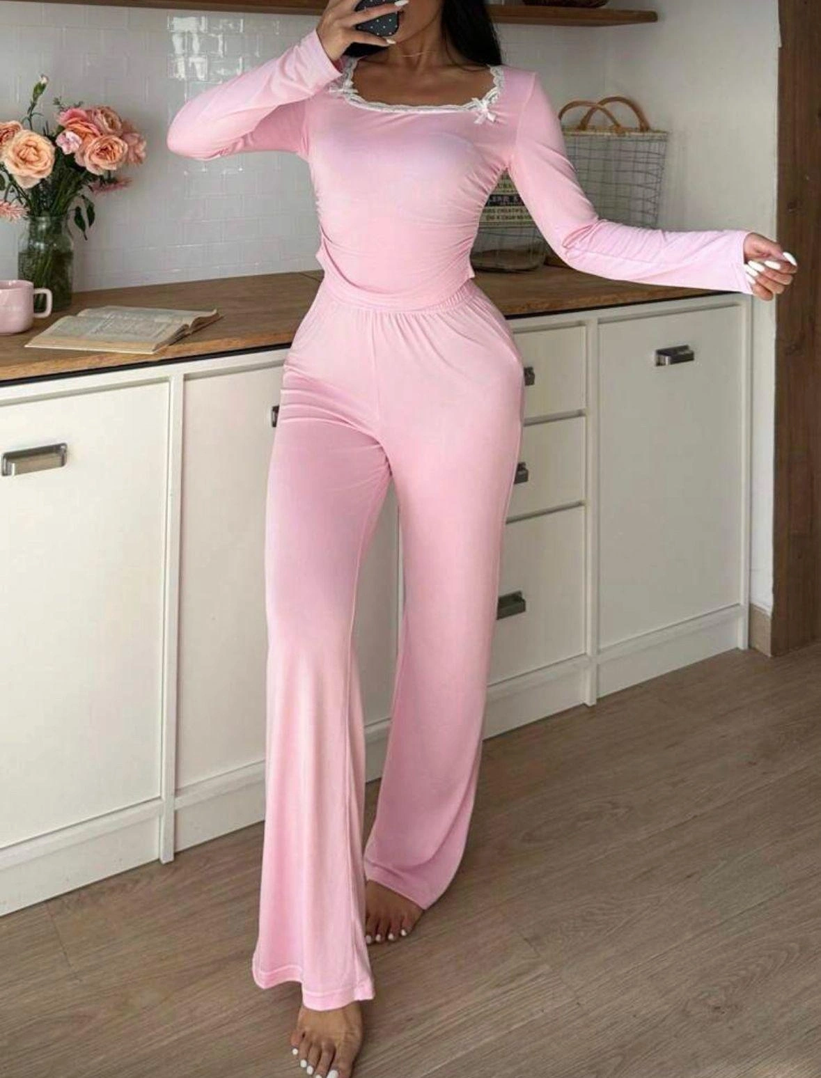 Soft pembe tonunun huzur veren enerjisini zarif detaylarla birleştiren bu ikili takım, şıklığından ödün vermeden rahat etmek isteyenler için tasarlandı. Modern kesimi ve romantik dokunuşlarıyla ev giyimine yeni bir soluk getiriyor.